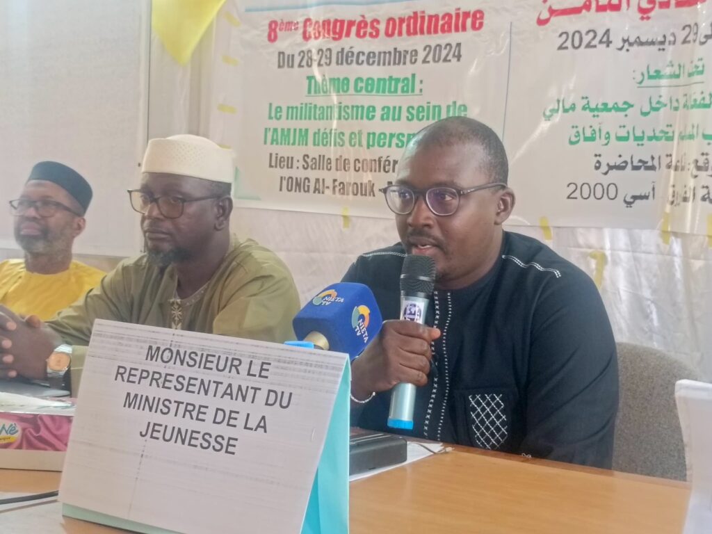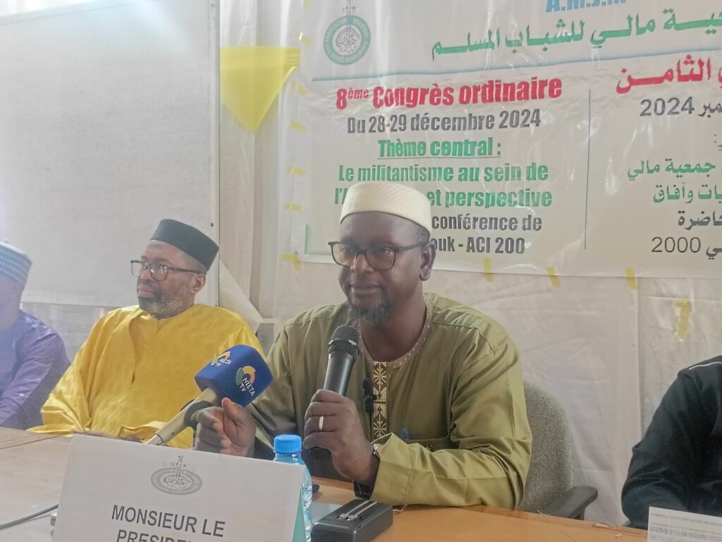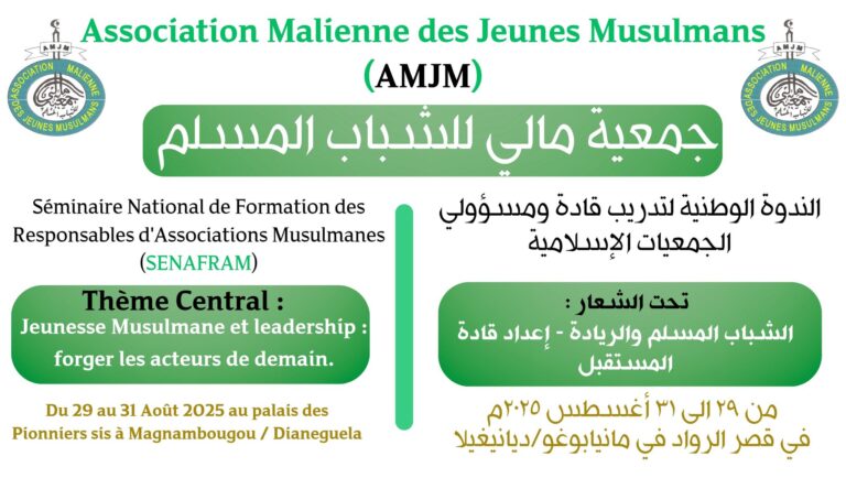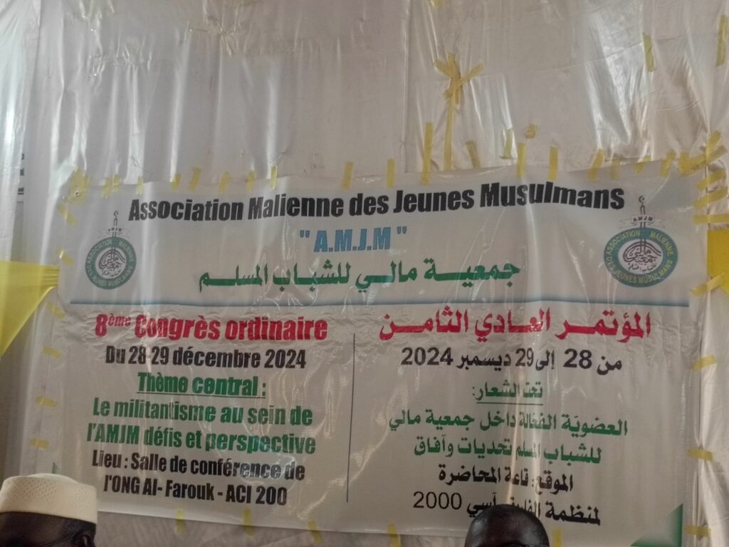 Le Bureau Exécutif National de l’Association Malienne des Jeunes Musulmans à l’honneur de vous inviter à prendre part à la cérémonie d’ouverture de son 8ème congrès ordinaire qui se tiendra le 28 Décembre 2024 à 10H dans la salle de conférence de l’ONG-Alfaouk-ex Almoudata sis à ACI 2000.