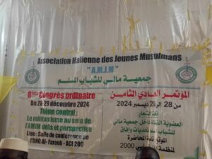 Le samedi 29/12/2024 dans la salle de conférence de ONG Alfarouk, s’est tenu le 8è congrès de l’Association malienne des jeunes musulmans du Mali – AMJM. la cérémonie était dirigé par Honorable Mohamed Lamine DJIGUINE, et Ousmane DIARRA le Président sortant, M. Bakary CAMARA un ancien Président de l’AMJM, Cheik Oumar DAFFE. il y’avait également M. Yacouba TRAORE, représentant du HCI et M. Aboubacar SANGHO, chargé de missions et représentant du Ministre de la jeunesse et du sport.